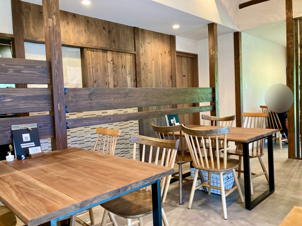店内は古民家の趣を活かした木の家具と白壁で統一され、温かみのある空間が広がっています。
