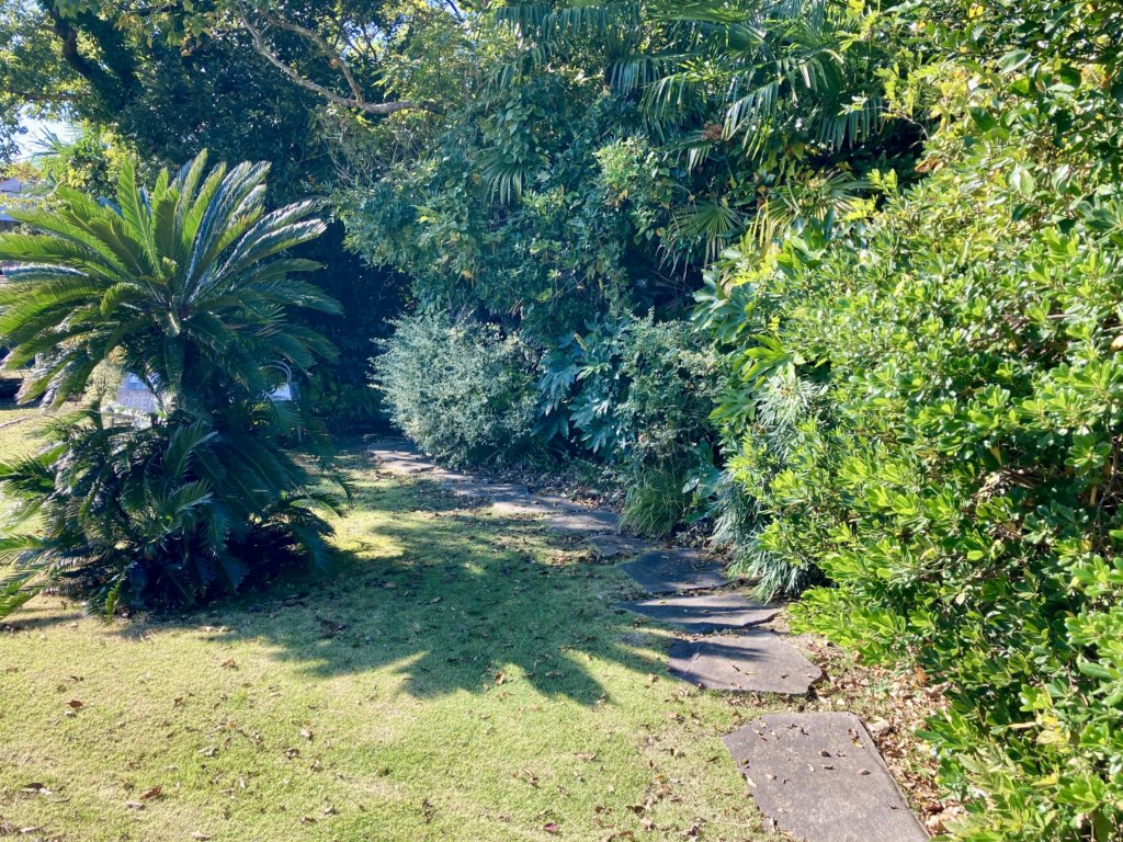 少しドキドキしながら進むと、植木に囲まれた敷地が現れ、その先には広々とした庭が広がっています。