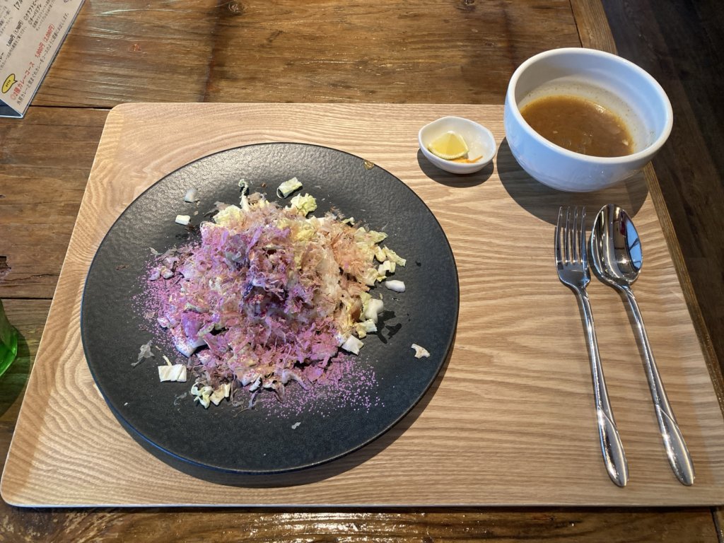 スープカレー風のスタイルで、カツオや季節の野菜・果物がトッピングされていて、スープカレーをかけていただきます。